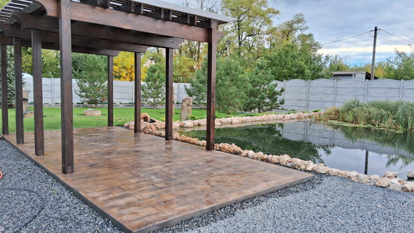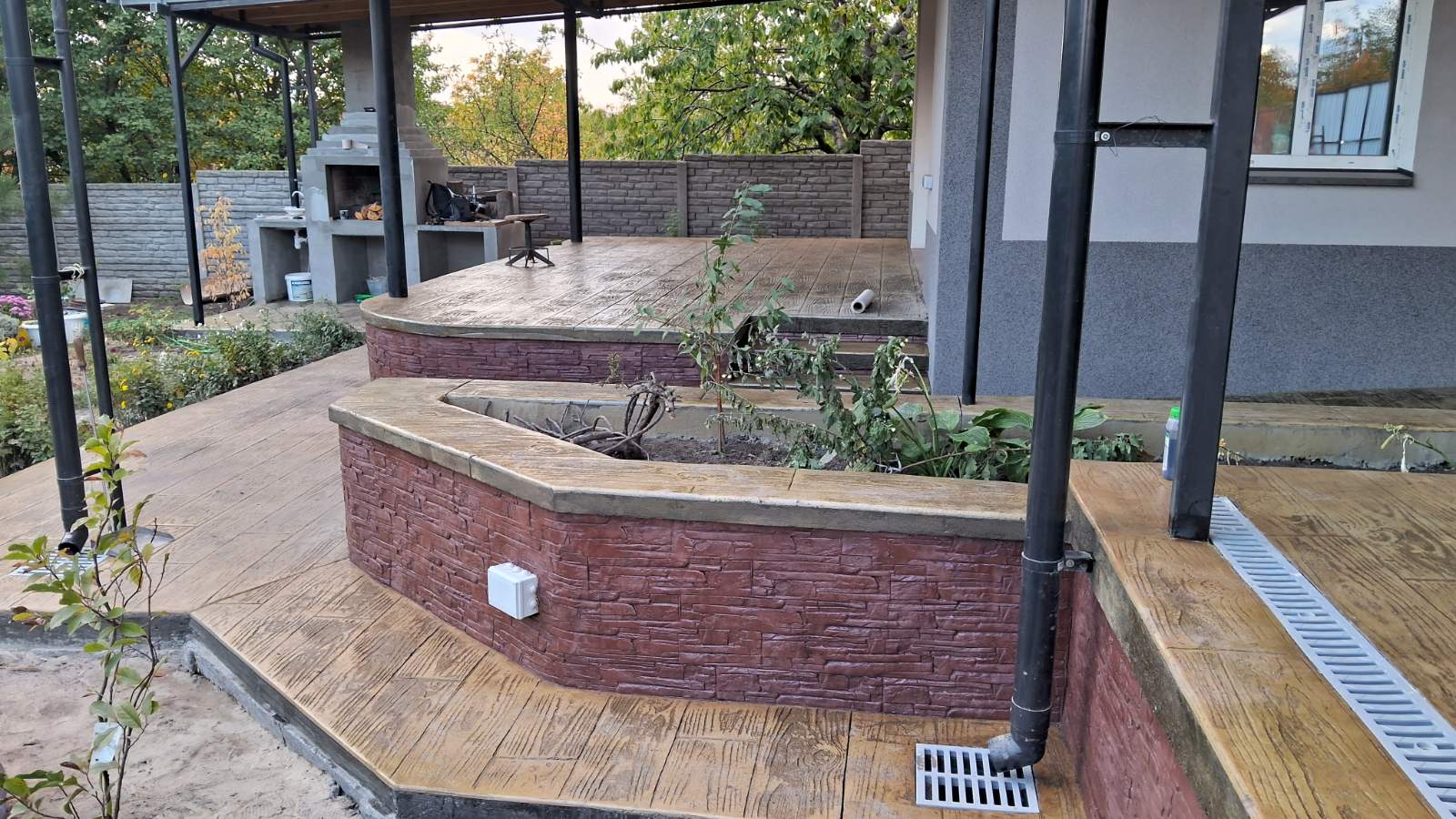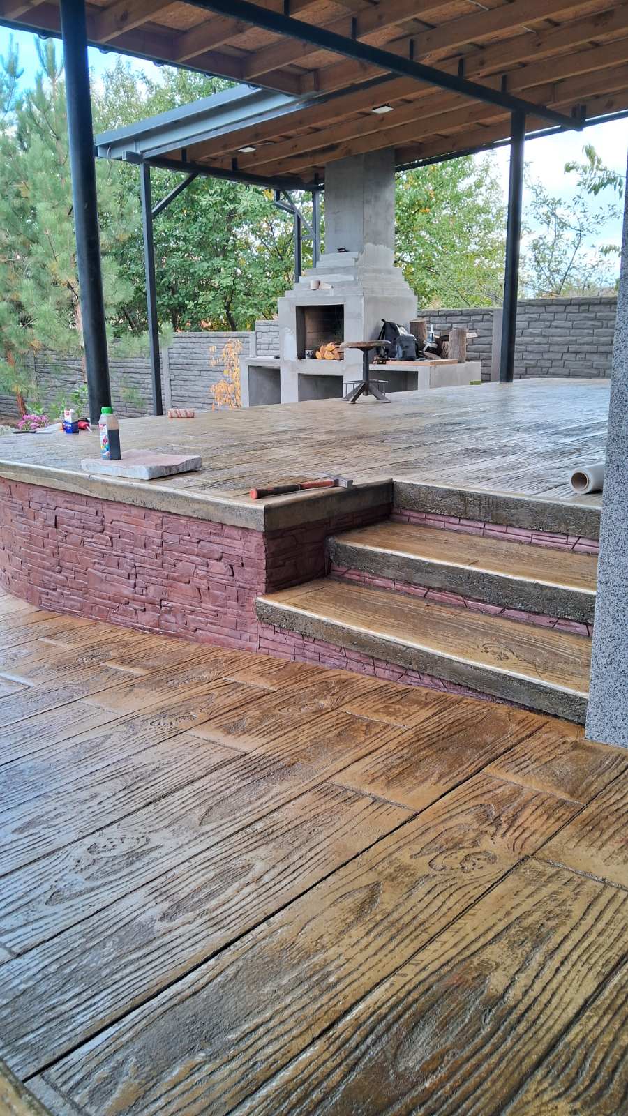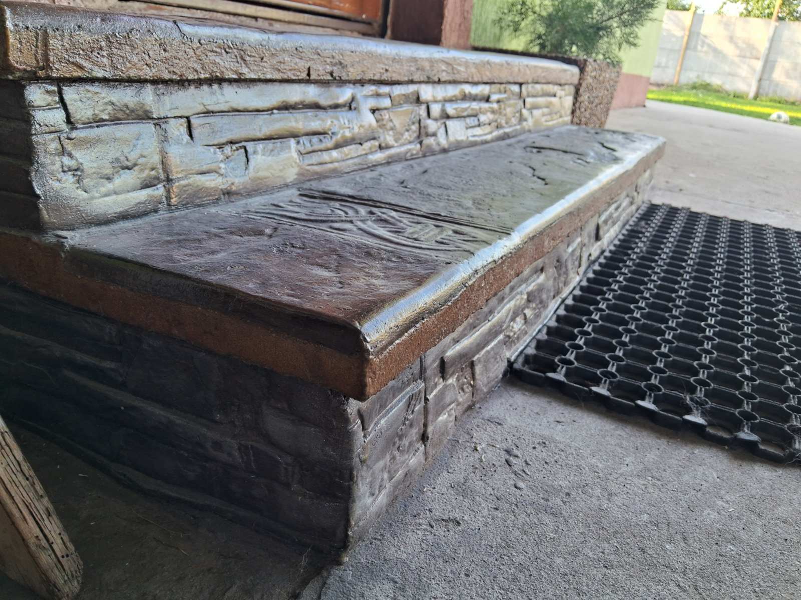 Ми допоможемо зробити ваш екстер'єр завершеним. Наші майстри виготовляють декоративні сходи, ґанки та вхідні групи за технологією штампованого бетону. Це дозволяє створити сходинки з фактурою деревини або каменю, які ніколи не згниють і не розхитаються.
